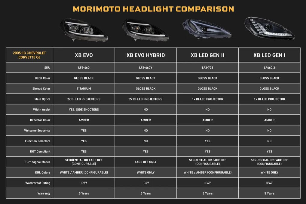 The all-new C6 XB Evo headlights are a showcase of everything Morimoto is made of. Thanks to an all-new generation of Morimoto Bi-LED projectors, the XB Evo Hybrid headlights will meet & exceed the highest standards for headlight performance that are set by the Insurance Institute for Highway Safety… which is a tough mark even for most modern luxury automakers. Compared to the base XB Evo Hybrid model, the Evo adds even more projector output via unique “side shooter” optics, a welcome sequence and DRL/turn signal function selectors. Regardless of which model you go for, we’re proud to stand behind the product with an industry-leading FIVE YEAR manufacturer warranty!