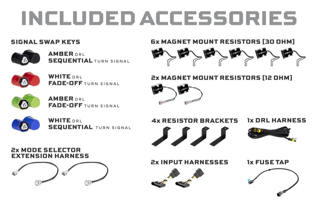 - Accessories: 8x (Four Pairs) Mode Selectors (EVO only), 8x Magnet-Mount Resistors, 4x Resistor Brackets, 2x Mode Selector Extensions (EVO Only), 2x Input Harnesses (EVO Only), 1x DRL Harness, 1x Fuse Tap